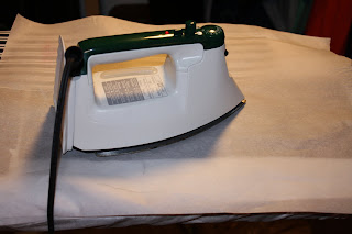 After I'm satisfied that all my fabric is wrinkle-free and wrong-side-down, I lay down my well-used sheet of parchment paper on top of the fabric. I take my hot, dry iron and slowly fuse the fabric to the interfacing. I am careful to make sure every piece is fused, but not overly concerned if some edges are loose because everything is getting ironed again on the reverse side later on.
