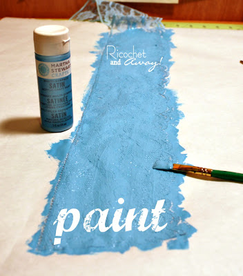 The lace I wanted to use was a pale blue.  It was pretty, but lacked the pow factor I was looking for.  I painted the lace with Pond on some freezer paper and hung it up to dry.